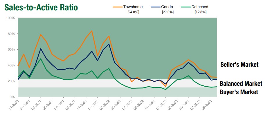 Across all detached, attached and apartment property types, the sales-to-active listings ratio for November 2023 is 16.3%. By property type, the ratio is 12.7% for detached homes, 19.8% for attached, and 18.2% for apartments.